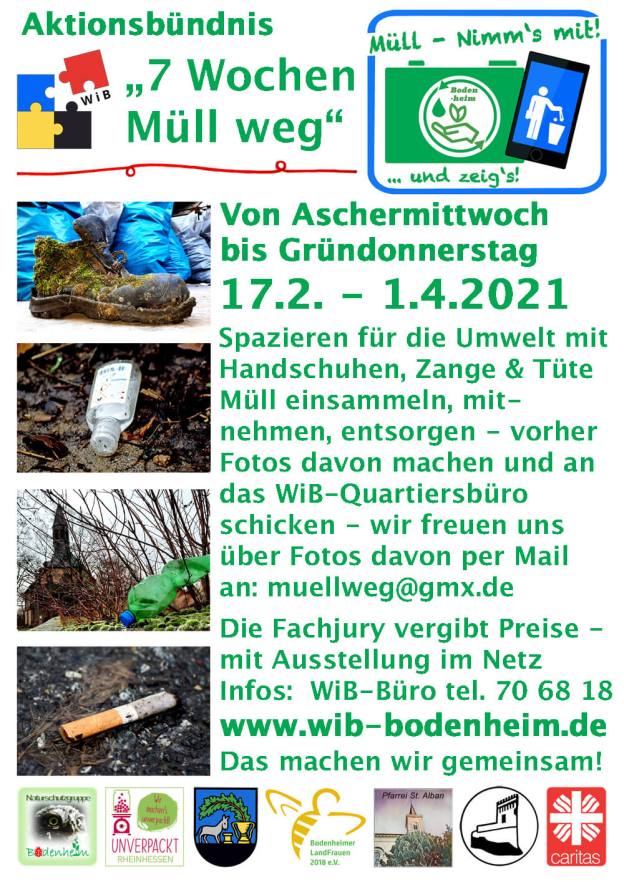 Die Naturschutzgruppe Bodenheim ruft, zusammen mit einem Aktionsbündnis aus „WiB – Wir in Bodenheim“ (Caritas), „Unverpackt Rheinhessen“, der Ortsgemeinde Bodenheim, der „Pfarrei St. Alban“, den „Bodenheimer Landfrauen 2018 e.V.“ und weiteren Akteuren, zum Müllsammeln auf. Von Aschermittwoch bis Gründonnerstag möchten wir die Natur in Bodenheim von Müll befreien. Aufgrund der Pandemie ist ein Sammeln in Gruppen nicht möglich, aber jeder Einzelne kann beim Spazieren gehen oder Sport Abfall einsammeln und entsorgen.