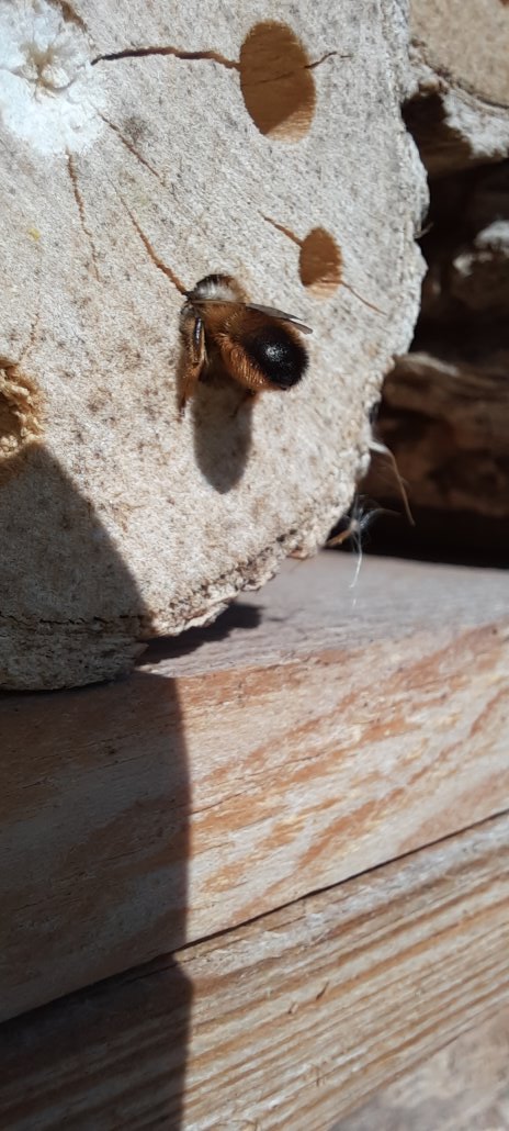 Außerdem haben wir unser Naturhotel weiter mit Nisthilfen bestückt – u.a. mit Hölzern, zwei schönen Häuschen, aber auch mit einer selbst gebauten Löss-Nisthilfe. Außerdem gibt es nun eine kleine Schublade, mit der man sehen kann, wie die Bienen eigentlich ihre Niströhren bestücken.
