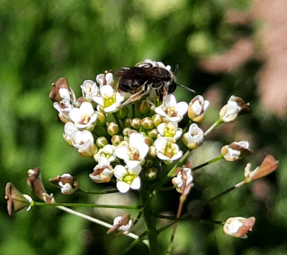 Und dass die Samenmischung aus dem Baumarkt nicht die beste Wahl ist, wird beim Blick auf die Lebensweise von Wildbienen klar: Viele Wildbienenarten sind auf bestimmte Blütenpflanzen spezialisiert. Dazu zählt beispielsweise die Zaunrüben-Sandbiene. Sie kann nur dort leben, wo auch die Pflanze existiert. Manche hängen sogar nicht nur von den Blüten ab, sondern von den Blättern der Pflanze. Die Weißfleckige Wollbiene schabt beispielsweise die wollige Behaarung von Königskerzen ab und baut mit ihnen ihre Nistgänge aus. Solche seltenere Vertreter der Wildbienen haben wir auf der Fläche noch nicht entdeckt. Dafür erkennt man deutlich, dass sich die Vielfalt erhöht. Welche Arten genau auftauchen, werden wir im Nachhinein noch dokumentieren. Ein Mitglied unserer Gruppe macht zur Zeit eine Weiterbildung zum Wildbienenbotschafter des BUND.