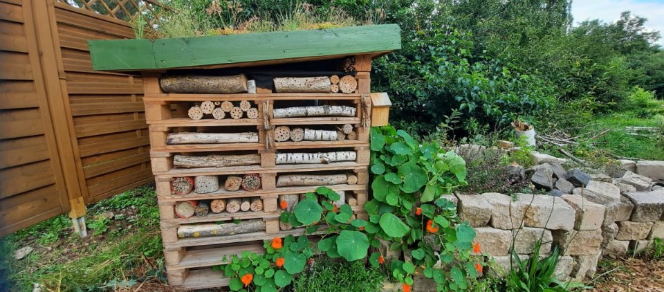 Die einzelnen Fächer der Paletten werden rundherum zudem mit Hölzern und Lehm als Nistmöglichkeiten für Wildbienen bestückt. Das Hotel erhält ein begrüntes Dach und noch einen weiteren Nistkasten. Wir haben darauf geachtet, möglichst viel Upcycling zu betreiben. Das zeigt mal wieder, dass Naturschutz nicht teuer sein muss, und teure Naturschutzprodukte sind nicht zwangsläufig besser als die selbst gemachten. Upcycling ist zudem oftmals die nachhaltigste Variante.