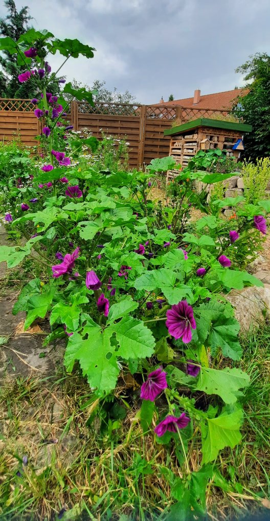 Übrigens habe ich mal meine Beobachtungen innerhalb der letzten 1,5 Jahre auf unserer Fläche zusammengefasst und bin doch erstaunt. Es haben sich knapp 30 Wildpflanzen eigenständig auf der Fläche angesiedelt. Und diese Liste ist bei weitem nicht vollständig. Dazu zählen z.B. Wilde Karde, Gewöhnlicher Reiherschnabel, Einjähriger Feinstrahl, Kleinköpfiger Pippau und Frühlings-Hungerblümchen. Der Pflanzenvielfalt folgten Tiere: Über dreißig konnten wir zählen, wobei darunter natürlich Besucher und Bewohner waren, Raupen genauso wie Imagos. Dazu zählen z.B. die Ameisen-Springspinne, Tagpfauenauge, Goldwespe, Stahlblauer Grillenjäger, Wespenspinne, Kleiner Heufalter, Langfühlerschrecken und Pelzbienen. Und vollständig ist diese Liste auch bei weitem nicht. Spannend wird nun sein, wie sich diese Vielfalt weiter entwickelt.