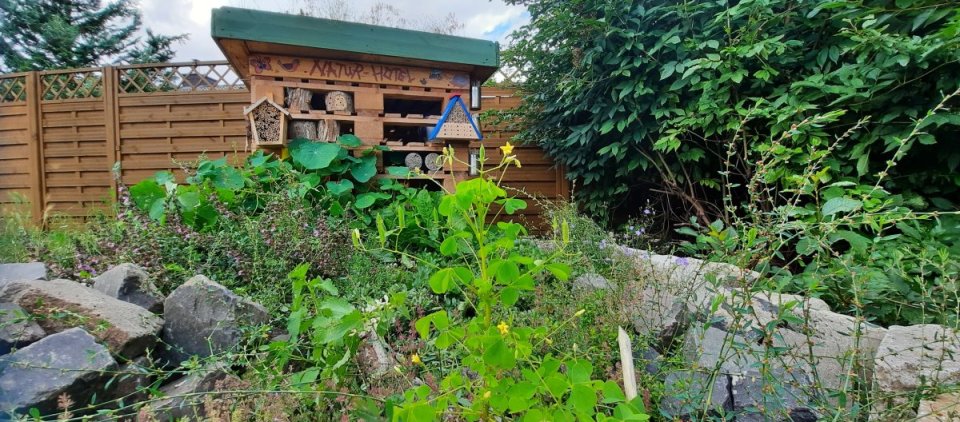An dieses etwa 1,20 m hohe Hotel werden zwei Trockenmauern angrenzen, die über Hohlräume für Reptilien verfügen. Die Befplanzung werden wir mit einheimischen und insektenfreundlichen Blumen vornehmen. Außerdem richten wir im Bereich der Trockenmauer noch ein Sandarium – also ein Sandbeet mit Totholzstücken und geringer Bepflanzung ein. Dieses dient bestimmten Wildbienen- und Wespenarten als Nistplatz, Eidechsen und Blindschleichen wird es ebenso magisch anziehen.